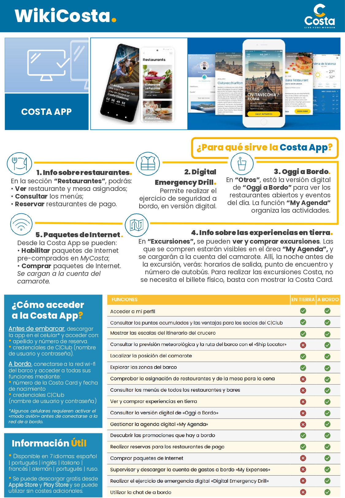 Descargá en tu celular la app "Costa APP" de forma gratuita antes de embarcar. Allí tendrás disponible toda la información del itinerario y la posibilidad de precomprar excursiones y paquetes WIFI.